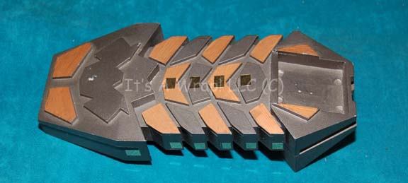 An item featured in various episodes of Star Trek: Deep Space Nine. This item was meant to perform as a Cardassian tricorder and is painted high quality cast resin with metallic copper painted accents, adorned with metallic gold adhesives. The item measures approx. 7.5 X 3 X 3.25 inches |