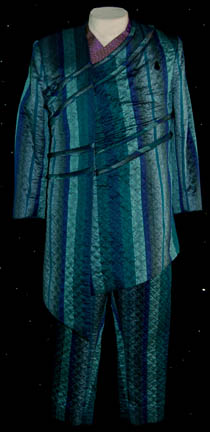 A costume featured in the Star Trek: Deep Space Nine episode “Tribunal” for wear by a child member of the Cardassian jury. The costume is made up of gray ruffled trousers that match the sleeves of the over dress which is built of neoprene components, black with a square patterned, … |