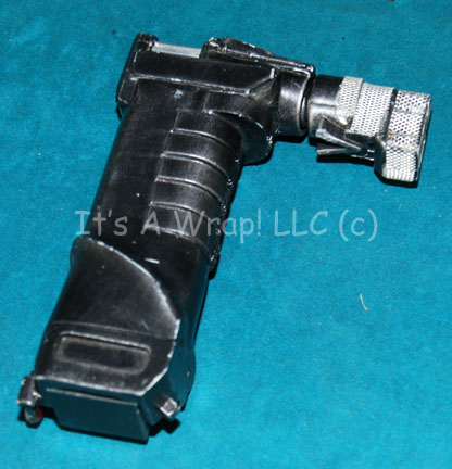 A prop item similar to those featured throughout Star Trek episodic television. This item is composed of a black, acrylic handle vaguely the shape of a modern-day cordless drill, textured accents around the finger grip, copper-colored “button” on the bottom, a button that activates the untested electronics at the back … |