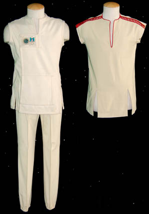A costume made up of elements featured in Star Trek II: The Wrath of Khan. The costume is a set of off white trousers with a white lily shirt that has a separation across the collar bones held together by red trim, and a researcher tabard that has an asymmetrical … |