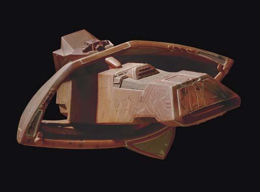 A visual effects model of a spaceship with cowled biplane drive section, designed by Rick Sternbach -- <I>20x13in.</I> -- first seen as a Vulcan starship in "Unification" in <I>Star Trek: The Next Generation</I>, later seen in "For the Cause" in <I>Star Trek: Deep Space Nine</I> and also as Tosk's ship … |