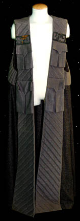 A Klingon robe featured variously in Star Trek episodic television. The robe is made from heavy gray-blue knit fabric with thick quilted accents in the front and around the sleeveless arms. The robe has four flap topped faux pockets with open bottoms and broken resin Klingon iconographic badges sewn onto … |