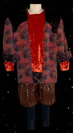 A pair of like costumes featured in Star Trek: Deep Space Nine for wear by a male and a female alien explorer. The costumes are trousers with copper mesh over patterned brown vinyl strips and an iridescent orange shirt with a multi-colored jacket featuring brown faux fur shoulders. The costumes … |