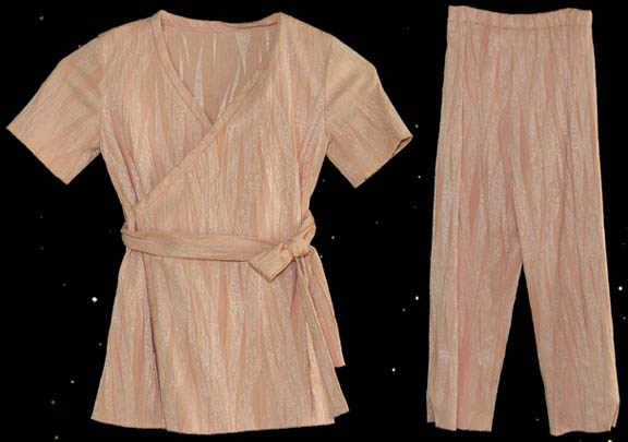 A costume featured in various episodes of Star Trek: Deep Space Nine for wear by Hana Hatae in the role of “Molly O'Brien”, daughter to “Miles” (Colm Meaney) and “Keiko O’Brien” (Rosalind Chao); and is a pink, iridescent, short-sleeved, kimono-style dress featuring a matching sash and trousers. A costumer’s tag … |