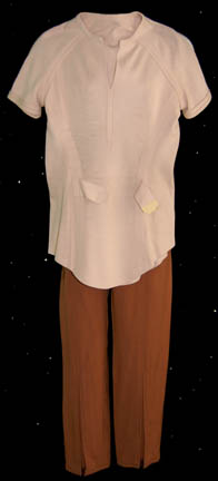 A beige Class-B short sleeved top with brown trousers featured in Star Trek I: The Motion Picture. The lot comes with an unattached plastic bio-monitor, a pair of engineering red colored division strips for the shoulders, and a red backed Epsilon IX assignment patch for the left breast. The costume … |