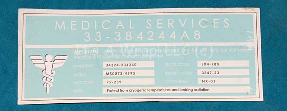 A white and teal ‘Medical Services' application carefully removed from a sickbay console set piece used to create the sickbay set of “Enterprise NX-01”. The item features Starfleet style caduceus and ‘inventory’ information. Measures approx. 7.25 X 3 inches. |