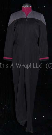 A Starfleet uniform in the style that made its first appearance in Star Trek VIII: First Contact; comprised of a full-length black jumpsuit with gray quilted shoulders, a form fitting elastic waistband sewn inside with attached loops for ‘away team' gear, a Velcro patch on the left breast for a … |