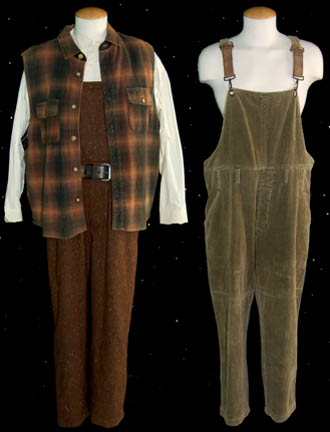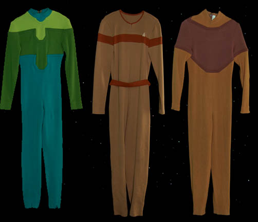 A trio of jumpsuit costumes featured in various episodes of Star Trek: Deep Space Nine for wear by Cirroc Lofton in his role as “Jake Sisko”. The costumes are a three colored green themed jumpsuit, a caramel colored one with a brown chest and back, and a tan one with … |
