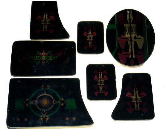 A lot of seven small smoked acrylic computer interface panels believed to be Jem'Hadar technology featured in various episodes of Star Trek: Deep Space Nine. The items are smoked acrylic panels cut to fit insets of consoles with graphical applications applied to the reverse. The multi-colored displays appear when held … |