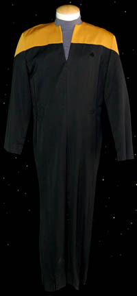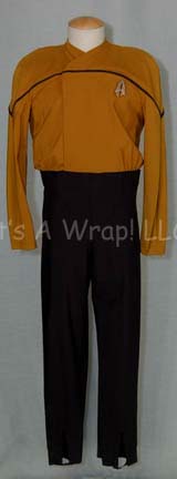 A costume featured in the series finales of both Star Trek: The Next Generation and Voyager. This costume is a future Starfleet uniform consisting of a long-sleeved, full-length, jumpsuit in Operations Gold, a false, wrap-around style, a black horizontal piping across the front, black trousers with stirrups for the feet, … |