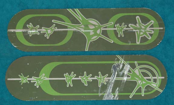 A pair of graphics appearing variously in episodes of Star Trek: Enterprise featuring Xindi characters. The items are sheet plastic flats with graphics adhered to their face and remaining double sided adhesive on the reverse. The items depict two differing instances of Xindi iconographic lettering in a green hue. A … |