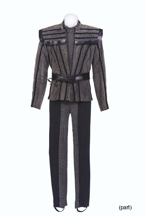 A Klingon-style grey leather jacket with black and silver embroidered trim, with a <I>Deep Space Nine</I> label inside inscribed <I>Terry Farrell</I>, with leather belt; and another jumpsuit with label inscribed <I>C. Cavert</I>, with corresponding wardrobe tag -- worn by Terry Farrell as Dax in "Blood Oath" (3) |