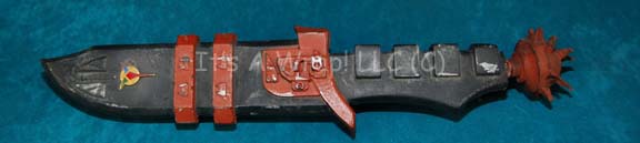 A Klingon knife made for use in Star Trek episodic television. Made of foam rubber the knife is painted black and brown, has faux spikes at the top of the hilt, many textured along the front and back, a small Klingon symbol near the bottom and, on the reverse side, … |
