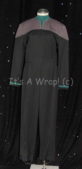 A Starfleet uniform in the style that made its first appearance in Star Trek VIII: First Contact and is comprised of a full-length black jumpsuit with gray quilted shoulders, black elastic stirrups at the feet, a form fitting elastic waistband sewn inside with attached loops for ‘away team’ gear, a … |