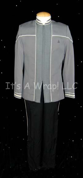 A costume featured in the opening sequences of Star Trek: Nemesis and worn by one the musicians playing at the wedding of “Commander Riker” (Jonathan Frakes) and “Deanna Troi” (Marina Sirtis). This costume is a long-sleeved, gray uniform jacket featuring stitched accents down the front, vertical and horizontal white piping, … |