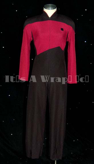 A costume featured in various episodes of Star Trek: The Next Generation. This costume is a Starfleet uniform jumpsuit featuring black shoulders, a Command Red chest, back, sleeves, and piping around the Mandarin collar; a black waist and legs that end in stirrups. This particular uniform has a zip down … |