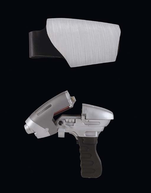 An injection-molded phase pistol prop with grey fabric-covered holster pouch, pistol prop is made from an Art Asylum toy, modified with additional surface graphics on the inside to suggest circuits and other technical details -- used by Jolene Blalock as T'Pol and other cast members in <I>Star Trek: Enterprise</I> |