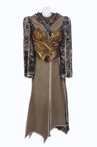 Klingon theatrical costume, comprising: a long-sleeved jacket of imitation fur and leather with fur sash adorned with gilt metal neckpiece, mounted with elaborate resin and glass fiber breast plate painted as bronze, with corresponding imitation leather skirt, collar, fingerless gloves and belt with Klingon-style metal buckle, with <I>Deep Space Nine</I> … |