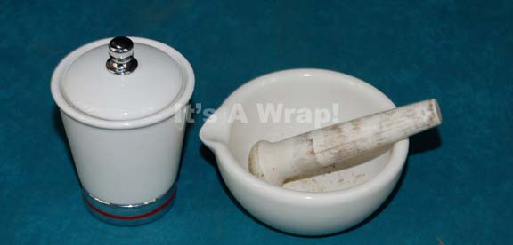 A lot of two ceramic based set dressing items appearing variously in episodes of Star Trek: Enterprise. The items are a white jar with a fitted lid, a metal base, and a mortar and pestle believed to have appeared in the episode “Civilization”. The items measure approx. 5.25 X 3.75 … |