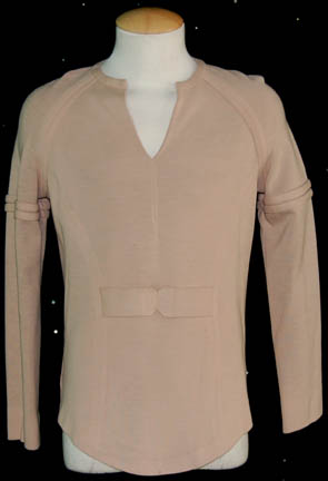 A costume top featured in Star Trek IV: The Voyager Home for wear by William Shatner in his portrayal of “Admiral Kirk”. The shirt is salmon-colored with an asymmetrical front that snaps diagonally up the right side and loops around a silver-colored button at the top. The cuffs feature Velcro … |