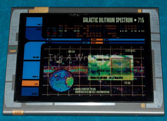 A PADD (Personal Access Display Device) believed to be featured in Star Trek IX: Insurrection on the desk of “Captain Picard” (Patrick Stewart). The item is a plastic display backlight altered for screen use. The item is colored metallic pewter with metallic silver and gold colored adhesive accents, with wall … |