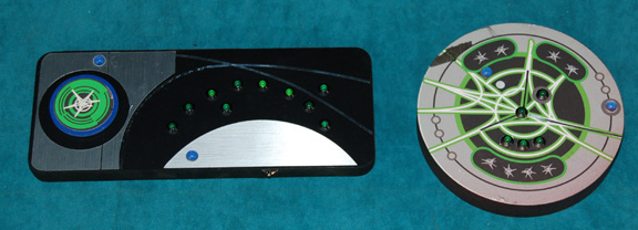 A pair of Xindi themed console controls featured in episodes of Star Trek: Enterprise. The items are made from sheet plastic on fashioned micro-density fiber wood with embedded lights and faced with graphical applications. The display graphic on the round item is paper with Xindi readouts and iconographic lettering, the … |