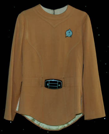 An out of the ordinary Class-A Starfleet uniform top made in the style of Star Trek I: The Motion Picture. The costume is oddly orange in color unlike any others and features an affixed silver backed Starfleet logo patch on the left breast indicating the wearer to be part of … |