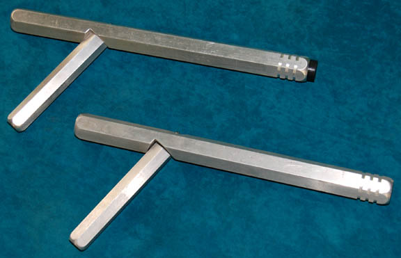 A paired lot of silver colored metal prop police batons featured in the Star Trek: Voyager episode “Time and Again”. The items are fashioned hexagonal affairs with a screwed on extension jutting out from one side similar to a nightstick. Notches are cut around the end of one side and … |