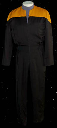 A male Operations Gold Starfleet uniform made for wear during the Star Trek: Voyager series. The uniform is black with Operations gold shoulders, a small Velcro patch on the left breast for a Combadge (not included) to attach, a zip up the front and two pleats in the back. Around … |