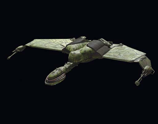 A filming miniature of the winged Klingon bird-of-prey spacecraft, acrylic plastic, milled aluminum, and resin, heavily detailed with distinctive falcon-feather paneling on wings, with power supply, assorted motion control mount cover plugs, cables and some mounting hardware -- <I>15x36in.</I> -- designed by Nilo Rodis for <I>Star Trek III: The Search … |
