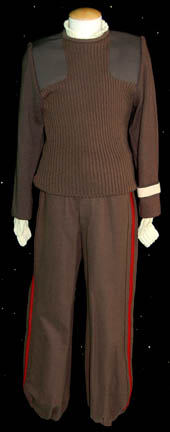 A stunt field duty/commando uniform featured in Star Trek V: The Final Frontier for wear by Dan Pulford in his portrayal of “Captain Kirk”. The costume is brown colored wool trousers with red stripes on the outside seams of the legs, a white long sleeved undershirt with a ribbed collar … |