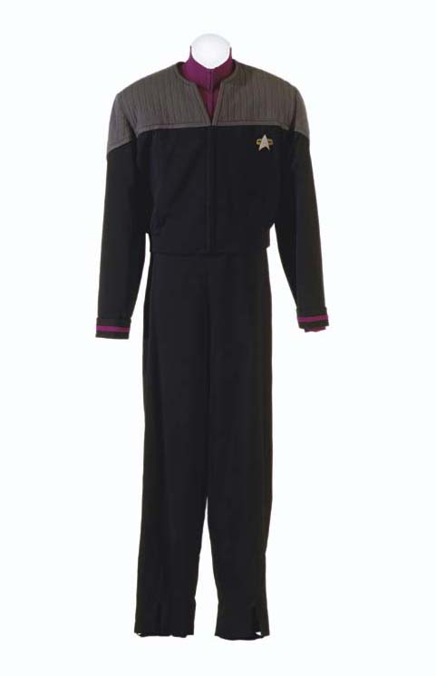 A black and grey late-season Starfleet uniform jacket, with Starfleet communicator badge, burgundy undershirt and corresponding black pants, pants with <I>Star Trek: The Next Generation</I> label inside inscribed <I>Avery Brooks</I>, shirt with <I>Deep Space Nine</I> label inside inscribed <I>Avery Brooks</I>; with corresponding wardrobe tag -- made for Avery Brooks as … |