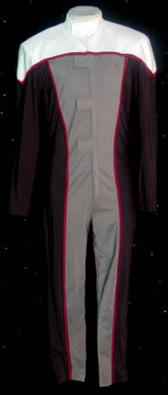 A Star Trek: The Next Generation male Command red Starfleet uniform made for wear during the series and/or ‘The Next Generation' movies. The jumpsuit is black with Command red sleeves and upper torso. There is red trim around the collar, a small Velcro patch on the left breast for a … |
