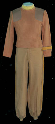 A costume featured in Star Trek V: The Final Frontier for wear by George Takei in his portrayal of “Sulu”. The costume is a caramel colored sweater with matching wool trousers which have a yellow division stripe down the outside seam of the legs, another division strip is present of … |