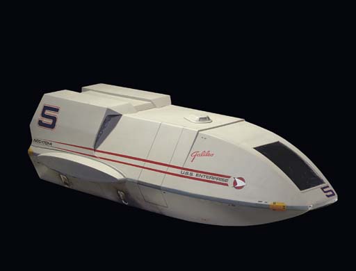 A visual effects model of a <I>The Motion Picture</I>-era <I>Enterprise</I> shuttlecraft, made from cast resin and glass fiber with plastic details, missing back panels, lower front windshield, engine pods, charring due to pyrotechnic effects in filming -- <I>60x27 (without engines) x16in. (without engines)</I> -- used for visual effects filming in … |