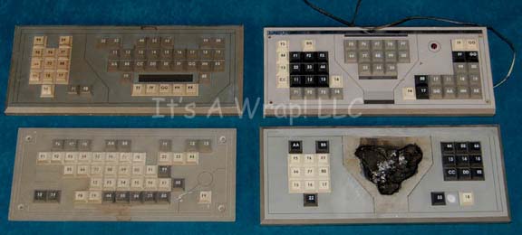A lot of four differing button panels featured in various episodes of Star Trek: Enterprise like ‘Terra Prime” and “Horizon”. The items are keyboard style featuring faux rubber buttons with numeric values. The items are adorned with graphical applications made to suggest dimension. One of the items features metallic silver … |