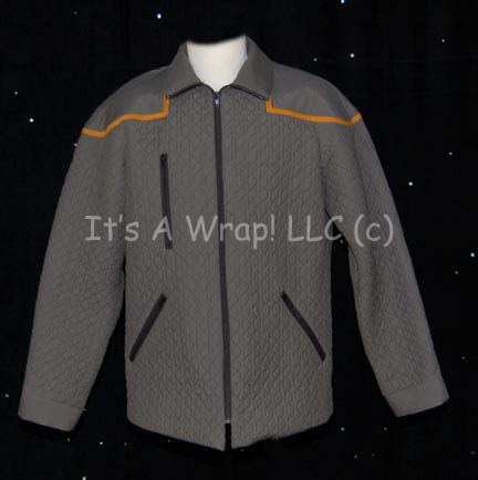A costume item used as a template or prototype for the “away team jacket” featured in various episodes of Star Trek: Enterprise. This item is a long-sleeved jacket featuring a quilted, hexagonal design, Command Gold trim around the shoulders, three zip pockets and a zip down the front. The item … |