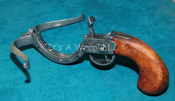 A prop item similar to those featured in the Star Trek: Voyager episode “Concerning Flight” and the Enterprise episode “Civilization. This item is a non-working, pewter-colored metal, miniature, weapon featuring intricate carved designs and a weathered wooden handle; it is small enough to fit in a cloak, has had the … |
