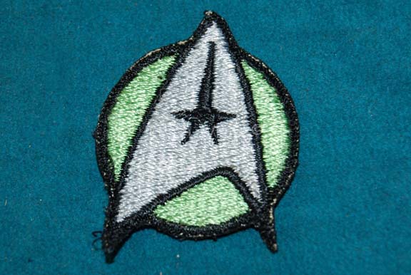 A costume element like those featured in various Star Trek feature films. This item is an emblem patch for wear on Starfleet uniforms, it consists of a silver-colored Starfleet emblem, outlined and detailed in black with a Medical green background. |