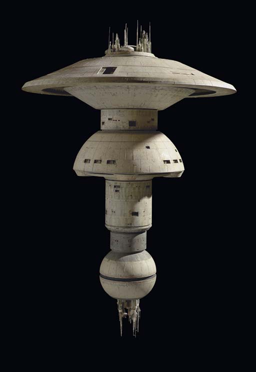 A mushroom-shaped space station model made of acrylic plastic and cast resin with brass and styrene details, motion control mounts, and untested internal neon lighting system, with stand, power supply and a box of loose parts -- <I>53x41in.</I> -- featured in <I>Star Trek III-VI</I>, this model also represented Starbase 74 … |