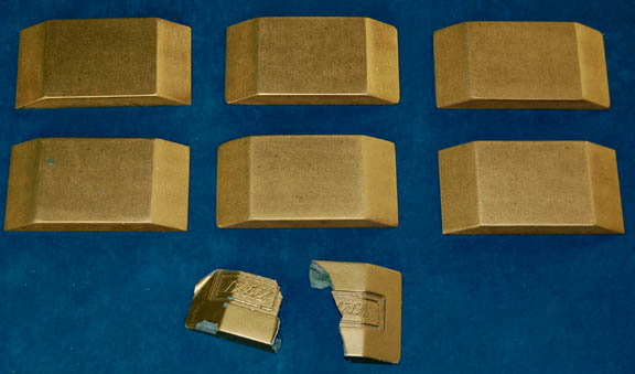 A lot of six faux ‘Gold Pressed Latinum' bricks featured in the Star Trek: Deep Space Nine episode “Who Mourns for Morn?” The items are trapezoid shaped slabs painted metallic gold with a pair of ‘broken’ resin pieces featuring molder alien iconography, also painted metallic gold. The items are mixed … |