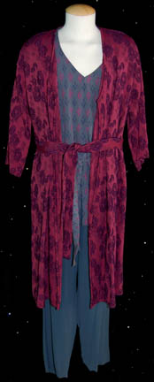 A lot of costumes featured in various episodes of Star Trek: Deep Space Nine. This lot includes two long-sleeved, full-length, matching robes in a burgundy fabric with a slightly wrinkled look, raised, purple brocade in a floral pattern, and matching sashes; two long-sleeved, pewter-colored, pajama shirts featuring roughly diamond shapes … |