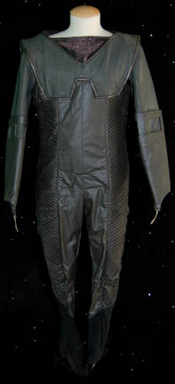 A costume featured in the Star Trek: Deep Space Nine episode “Tribunal”; wherein “Chief O'Brien” is accused of conspiring with the Maquis by the Cardassians and has to prove his innocence in a court where all are assumed guilty. This costume is a long-sleeved, full-length, gray vinyl jumpsuit featuring a … |