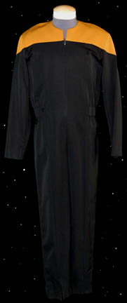 A costume featured in various episodes of Star Trek: Voyager for wear by Garrett Wang in the role of the Operations Officer for the Starship “Voyager”, “Ensign Harry Kim”. This costume is a type-B Starfleet uniform consisting of long-sleeved, full-length, black jumpsuit featuring Operations Gold division colors along the shoulders, … |