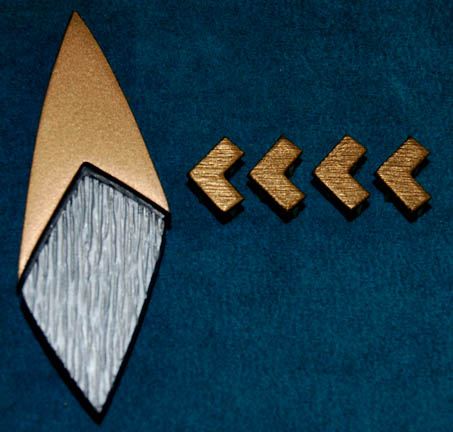 A molded resin combadge and rank featured in the Star Trek: Voyager episode “Relativity” for wear by crewmen on board the Federation timeship “Relativity”. The combadge is painted metallic silver and gold and resembles the familiar Starfleet emblem sideways, the badge is unpainted on the reverse and has no Velcro … |