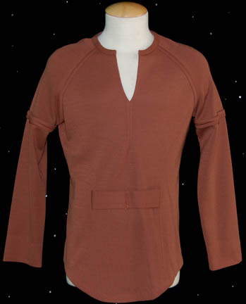 A brown colored long sleeved Class-B Starfleet uniform shirt featured in Star Trek I: The Motion Picture. The shirt comes with these unattached elements: a sciences orange Epsilon IX assignment patch, a pair of orange division strips, and a plastic bio-monitor. The shirt is intended for male wearers. |
