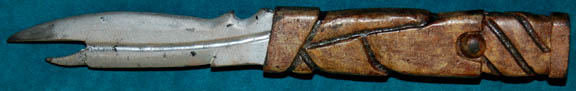 A prop weapon similar to those featured throughout Star Trek episodic television and feature films. This item is a cast rubber knife featuring a brown handle, deep grooves culminating in a rough spiral pattern near the butt and a metal-colored, beveled blade with a similar along its length. The item … |