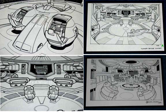 A set of twenty-one concept drawings that are each applied to black poster board and are not originals. The items depict various bridge concept ideas created for Star Trek: Voyager which feature some design elements that may have been later included in other Starfleet ship sets. Interesting unused designs include … |
