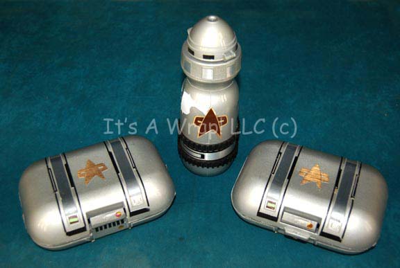 A set of two Starfleet standard issue ration packs and one water bottle featured in Star Trek IX: Insurrection. The items are metallic-gray colored plastic boxes with hinged lids. The items are accented with metallic-silver adhesive details and feature metallic silver Starfleet emblems and Starfleet inventory applications reading ‘806, Emergency … |