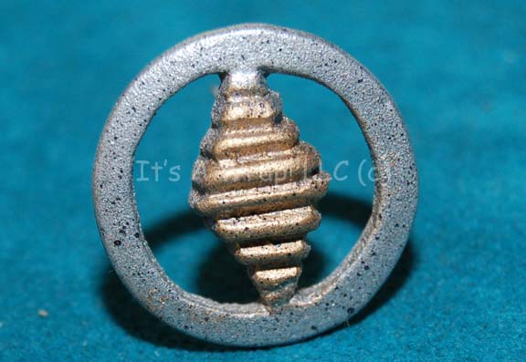 A molded resin rank accent for crewman’s costumes appearing in various Star Trek feature films. The item is a small circle painted metallic silver with a similarly painted and a gold painted diamond center piece. The item features metal wire glued to the reverse for attachment to a rank placement … |